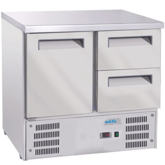 Stół chłodniczy Arktic z 1 drzwiami i 2 szufladami z panelem sterowania z cyfrowym termostatem, automatycznym cyklem rozmrażania i łatwym w demontażu filtrem kondensatora. Agregat umieszczony pod urządzeniem, z otworami wentylacyjnymi w obudowie zapewnia lepszą cyrkulację powietrza.