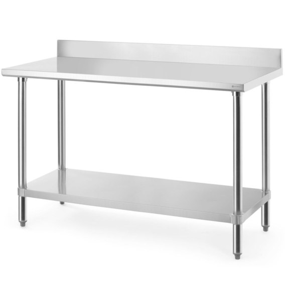 Stół przyścienny z półką, skręcany firmy HENDI ma trwałą i łatwą do czyszczenia powierzchnię roboczą. Blat oraz półka zostały wykonane ze stali nierdzewnej i posiadają udźwig po 130 kg. Półka jest bezpiecznie połączona z nogami za pomocą aluminiowych kołnierzy. Nogi posiadające regulacje wysokości zapewniają stabilność na nierównych podłogach. Wykończony praktycznym rantem tylnym blat został zaprojektowany z myślą o intensywnym, codziennym użytkowaniu.