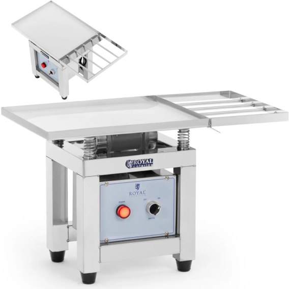 Stół wibracyjny marki Royal Catering pozwala przyrządzić idealną czekoladę w cukierni czy piekarni. Za jego pomocą można niezawodnie zagęszczać masę kakaową i unikać kieszeni powietrznych. Dzięki kompaktowej konstrukcji sprzęt można ustawić na dowolnym blacie. Dlatego nadaje się również dla małych producentów czekolady i cukierni. Dodatkowo konstrukcja jest bardzo prosta. Ciągła powierzchnia wytrząsająca pozwala szybko i łatwo wytrząsać bąbelki powietrza z masy czekoladowej. Na batonach natomiast usuwa nadmiar czekolady z foremek podczas robienia skorupek. Daje to czekoladzie pożądaną strukturę i stabilność. Stół wykonano z mocnej i higienicznej stali nierdzewnej, jest łatwy w czyszczeniu. Gumowane nóżki redukują wibracje na powierzchni roboczej i chronią blat przed zarysowaniami.