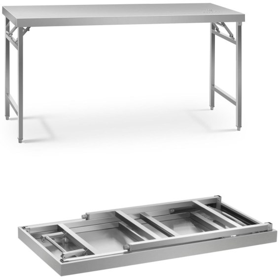 Stół posiada system składania sprężynowego - w szybki i łatwy sposób można go złożyć i transportować. Został wykonany ze stali nierdzewnej co jest gwarancją trwałości i stabilności w trakcie pracy. Jest odporny na korozję, uporczywe zabrudzenia i uszkodzenia mechaniczne. Nie wchodzi w reakcje z żywnością, jest bezpieczny dla zdrowia. Blat o wymiarach 180x60 cm zapewnia dużo miejsca. Dzięki regulowanym nóżkom wysokość stołu można zmienić w zakresie +/- 10mm. Udźwig stołu wynosi 230 kg.