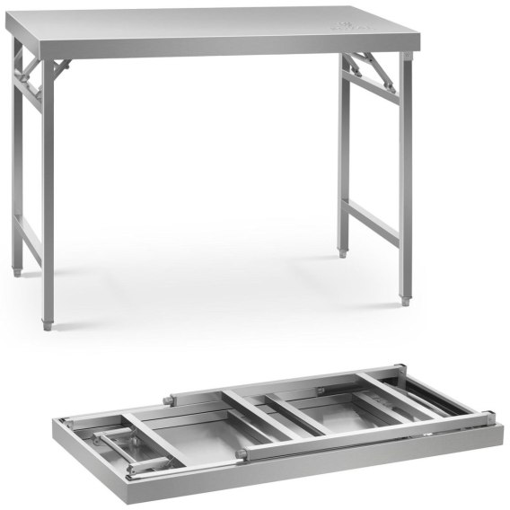Stół posiada system składania sprężynowego - w szybki i łatwy sposób można go złożyć i transportować. Został wykonany ze stali nierdzewnej co jest gwarancją trwałości i stabilności w trakcie pracy. Jest odporny na korozję, uporczywe zabrudzenia i uszkodzenia mechaniczne. Nie wchodzi w reakcje z żywnością, jest bezpieczny dla zdrowia. Blat o wymiarach 120x60 cm zapewnia dużo miejsca a wysokość 85 cm daje komfort użytkowania. Dzięki regulowanym nóżkom wysokość stołu można zmienić w zakresie +/- 10mm. Udźwig stołu wynosi 210 kg.