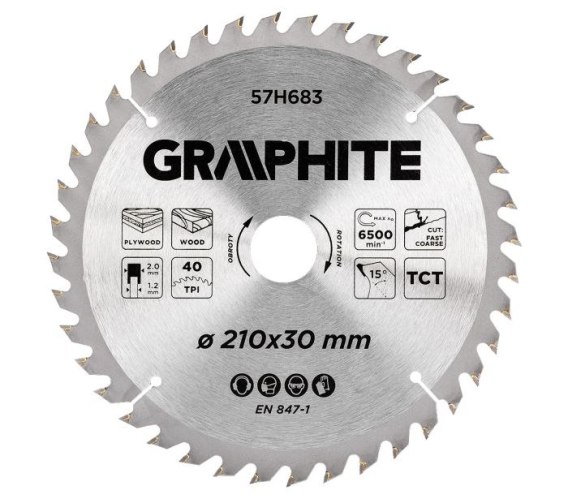 Tarcza do pilarki, widiowa, 210 x 30 mm, 40 zębów 57H683 GRAPHITE to narzędzie stworzone z myślą o precyzyjnym i szybkim przecinaniu drewna oraz sklejki. Dzięki grubości tarczy wynoszącej 1,2 mm i szerokości zęba 2 mm, tarcza zapewnia efektywne, czyste oraz dokładne cięcie. Zestaw zawiera redukcje 25,4/20/16, co pozwala na dopasowanie tarczy do różnych modeli pilarek, w tym do tej dedykowanej marki GRAPHITE, do modelu 58GE121. Maksymalna prędkość obrotowa tarczy wynosi 6500 min-1, gwarantując szybkie i skuteczne cięcie materiałów. Tarcza GRAPHITE to niezawodne narzędzie dla profesjonalistów oraz majsterkowiczów, którzy cenią sobie jakość i precyzję w obróbce drewna czy też sklejki.