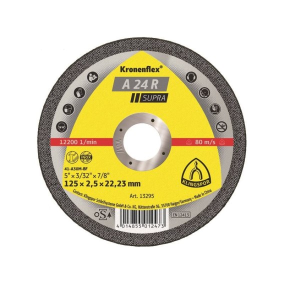 Zalety: Optymalna receptura do obróbki stali - Możliwość zastosowania również do cięcia stali szlachetnej - Dobra wydajność cięcia. Tarcza dostępna w rozmiarach zarówno na szlifierki kątowe, oraz w dużych średnicach przeznaczonych pod przecinarki stacjonarne. Optymalna do przecinarek stacjonarnych 3 - 5 KW. Standardowa tarcza o wysokiej wydajności cięcia.