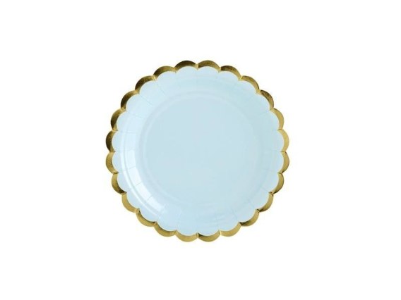 Talerzyki papierowe w kolorze jasnoniebieskim ze złotymi metalizowanymi brzegami, średnica ok. 18 cm.(1 op. / 6 szt.)