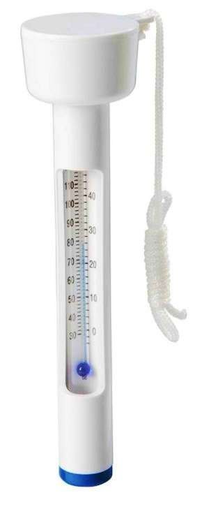 Termometr spławikowy do mierzenia temperatury wody w basenach. Termometr w wodzie unosi się pionowo co ułatwia odczyt a przyczepiony sznurek sprawia łatwy montaż.