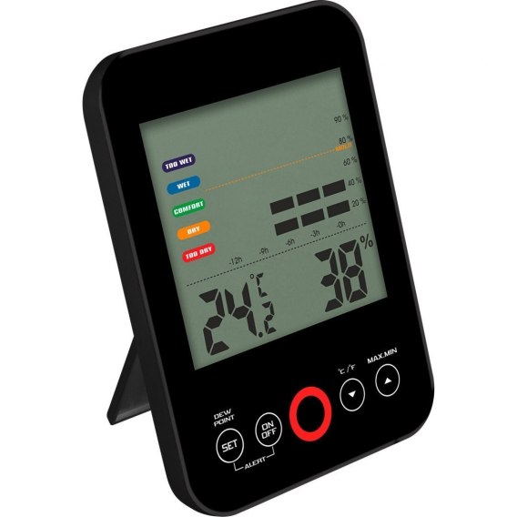 - Programowalne wyższe/niższe ustawienie wilgotności względnej powietrza - z alarmem dźwiękowym i za pomocą diody LED