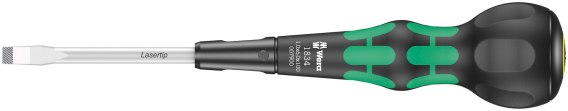 Wkrętak Kraftform serii 1800 do śrub z nacięciem prostym (z rowkiem). Rękojeść doskonale leży w dłoni. Kulisty kształt umożliwia przenoszenie wysokich momentów obrotowych. Miękkie strefy chwytu zapewniają dobry chwyt i bezstratne przenoszenie sił. Twarde strefy chwytu umożliwiają przenoszenie dużych sił, nawet przy nacisku nasadą dłoni. Wgłębienia na palce w górnej części rękojeści ułatwiają precyzyjną regulację podczas wkręcania. Smukłe przejście między rękojeścią a trzpieniem ułatwia dotarcie nawet do trudno dostępnych i głęboko położonych śrub w wąskich przestrzeniach. Zabezpieczenie na końcu rękojeści utrudnia staczanie się narzędzia z miejsca pracy. Końcówka Lasertip posiada mikroskopijne rowki wypalane promieniem lasera, tworzące chropowatą powierzchnię, która dosłownie "wgryza się" w gniazdo śruby. Zapobiega to wyślizgnięciu się narzędzia.