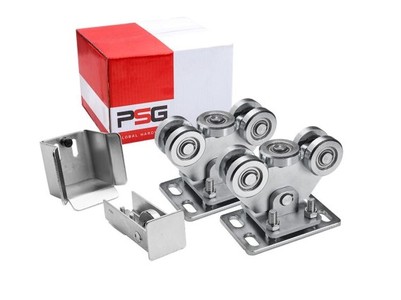 Pakiet wózków jezdnych 60.003 do bram przesuwnych samonośnych z szyną 80x80x5 mm, wraz z akcesoriami do montażu bramy.
