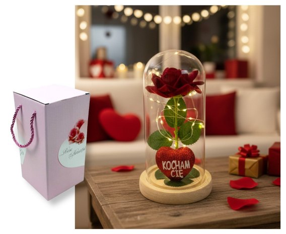 Wieczna RÓŻA LED czerwona na drewnianym podstawku z sercem 21 x 11 cm VAF-2405