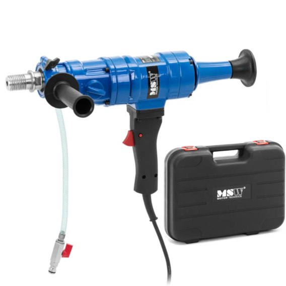 Wiertnica do betonu marki MSW pozwoli na wycinanie otworów w twardych materiałach budowlanych, takich jak beton, mur czy asfalt. Charakteryzuje się wyjątkowo niską emisją wibracji, co zapewnia precyzję wiercenia. Wiertarkę rdzeniową można zabrać ze sobą na plac budowy w poręcznej walizce i użyć jej do precyzyjnego wiercenia w każdej sytuacji. Ręczna wiertnica diamentowa zapewnia moc 1500 W i maksymalną prędkość obrotową 2100 obr./min. Są to idealne wartości do uzyskania otworów o średnicy do 102 mm. Dzięki niskiemu zużyciu energii można wykorzystać ją nawet z agregatem prądotwórczym. Aby uzyskać precyzyjne wyniki wiercenia, należy wykorzystać wbudowaną poziomicę i dodatkowy uchwyt boczny. Do dyspozycji są też są różne poziomy mocy zapewniające optymalne wyniki. Dzięki temu można użyć wierteł o największej średnicy przy najniższej prędkości. Podczas wiercenia można polegać na niezawodnym chłodzeniu wodą. Złącze wykonane z wysokiej jakości kutej stali jest zintegrowane bezpośrednio z wiertarką rdzeniową. Zastosowanie wody znacząco ogranicza zużycie wiertła. Maszyna wymaga więc mniej konserwacji i ma dłuższą żywotność. Zmniejsza się również ilość pyłu powstającego podczas wiercenia, a wiertło rdzeniowe mniej się nagrzewa. Kabel zasilający o długości 2,19 m zapewnia maksymalną swobodę ruchów. Dzięki zintegrowanemu wyłącznikowi różnicowoprądowemu (PRCD - Portable Residual Current Device) można zawsze bezpiecznie korzystać z urządzenia. Jeśli dojdzie do zwarcia w okolicy wiertnicy do betonu lub przewodu, praca zostanie natychmiast zatrzymana.