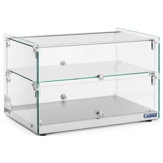 Witryna marki Royal Catering pozwala prezentować ciasta, tarty, bajgle, desery i inne przysmaki w kuszący sposób. Elegancka witryna neutralna sprawdzi się na ladach w piekarniach, cukierniach, bistro, kawiarniach i wszędzie tam, gdzie świeżo przygotowane specjały mają być atrakcyjnie prezentowane i jednocześnie utrzymane w świeżości. Pojemność 50 l oraz 2 poziomy o wymiarach 54 x 29,5 cm oferują dużo miejsca. Na każdej półce można umieścić do 10 kg ciast, pieczywa i innych przysmaków. Duże drzwi z przodu gabloty panoramicznej umożliwiają łatwe napełnianie i wyjmowanie produktów. Witryna została wykonana ze szkła hartowanego i stali nierdzewnej, wygląda wyjątkowo elegancko, ale również imponuje długą żywotnością. Jest też bardzo łatwa w czyszczeniu. Antypoślizgowe nóżki zapewniają pewne oparcie i niezawodnie chronią powierzchnię blatu przed zarysowaniami czy uszkodzeniami.