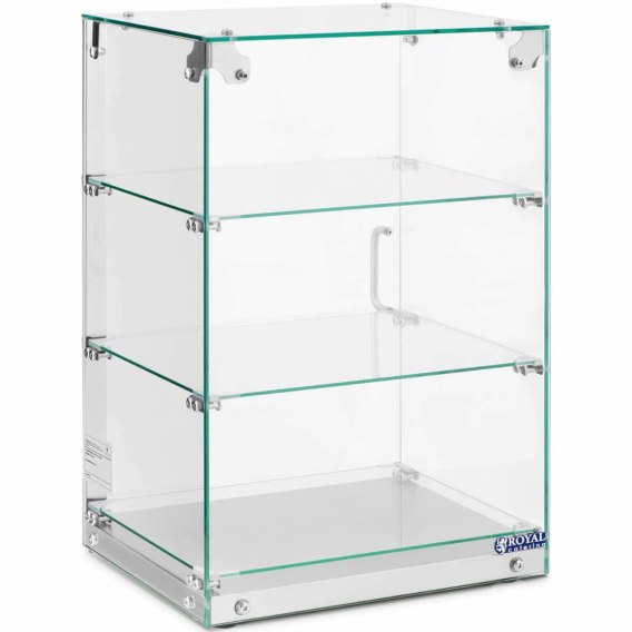 Witryna marki Royal Catering sprawdzi się do prezentacji ciast, deserów czy innych przysmaków w piekarniach, kawiarniach, cukierniach. Pojemność witryny wynosi 60 l. 3 poziomy posiadają wymiary 39 x 30 cm. Każda półka pomieści do 12,5 kg ciast, pieczywa czy deserów. Gablota wykonana została ze szkła hartowanego i stali nierdzewnej. Ma elegancki wygląd i jest łatwa w czyszczeniu. Antypoślizgowe nóżki zapewniają jej stabilność i chronią powierzchnię blatu przed zarysowaniem.