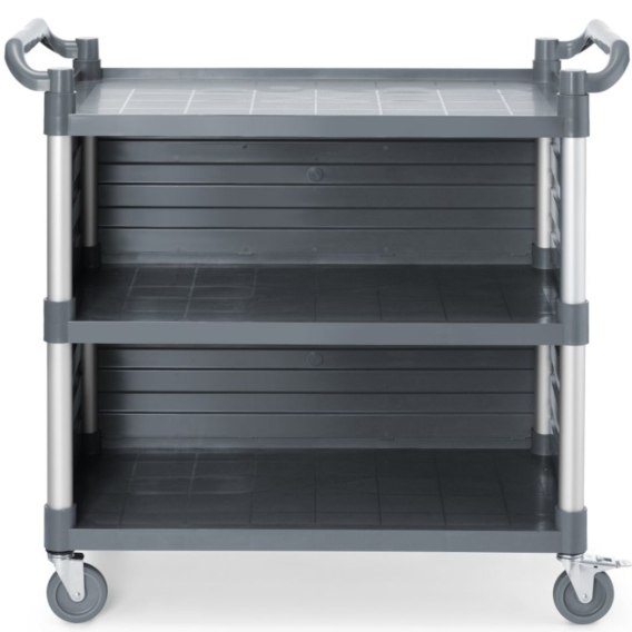 Wózek kelnerski 3-półkowy firmy AmerBox sprawdzi się jako mobilne narzędzie pracy z możliwością składowania. Płynnie porusza się po nierównych powierzchniach, w windach czy przejściach. Górna półka na ergonomicznej wysokości oraz boczne panele zapewniają większy komfort pracy.