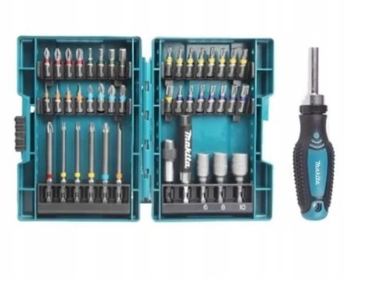 pozostałe elementy: etui z tworzywa sztucznego, wkrętak z grzechotką, dwa uchwyty na bity
