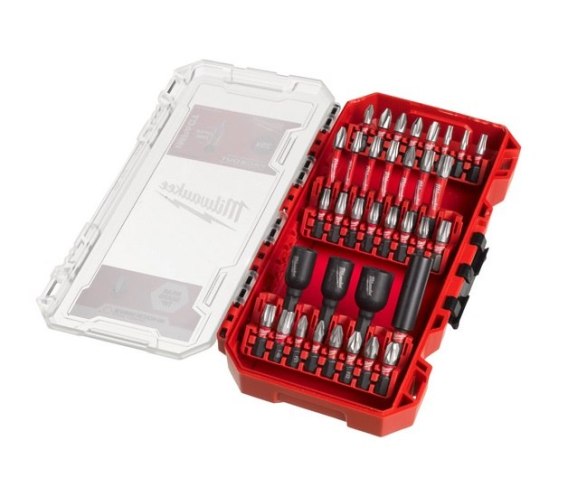 Bity udarowe SHOCKWAVE™: 24 x 25 mm długości 1 x PH1 / 3 x PH2 / 1 x PH3, 2 x PZ1 / 3 x PZ2 / 1 x PZ3, 2 x TX10 / 2 x TX15 / 3 x TX20 / 3 x TX25 / 2 x TX30 / 1 x TX40. 7 x 50 mm długości 1 x PH2 / 1 x PZ2, 1 x TX15 / 1 x TX20 / 1 x TX25 / 1 x TX30 / 1x TX40. 3 x Udarowa magnetyczna nasadka sześciokątna: 48 mm długości 1 x Hex 7 mm / 1 x Hex 8 mm / 1 x Hex 10 mm. 1 x magnetyczny uchwyt bitów SHOCKWAVE™ 60 mm