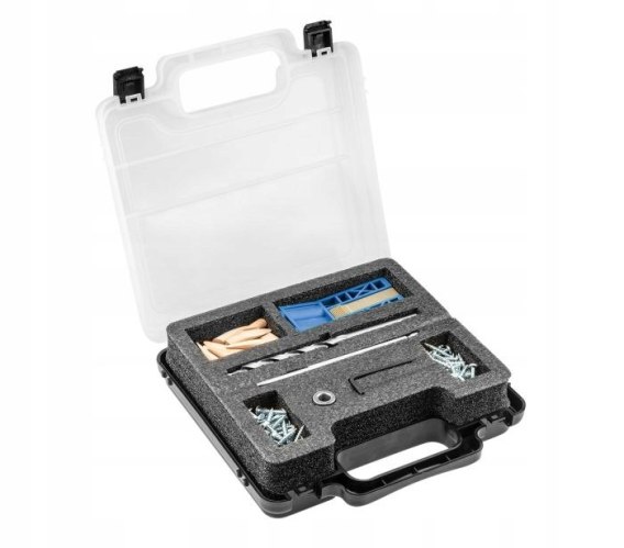 Zestaw do połączeń niewidocznych, 76 elementów 55H250 marki GRAPHITE pozwala na niewidoczne łącznie ze sobą dwóch desek, poprzez wwiercanie się w drewno pod odpowiednim kątem. Zestaw oferowany jest w praktycznej walizce i składa się na 76 indywidualnych elementów: klucz sześciokątny, 48 x wkręty do drewna, 24 x kołki do drewna, wiertło do pracy w drewnie, połączenia narożnikowe (typu ,,T", czołowe lub ukośne). Polecany do warsztatów stolarskich.