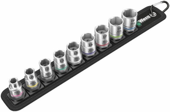 Wytrzymała zawieszka tekstylna wykonana w stylu charakterystycznym dla firmy Wera z 9 kluczami nasadowymi i narzędziem do usuwania nakrętek do pracy w ograniczonych przestrzeniach.
