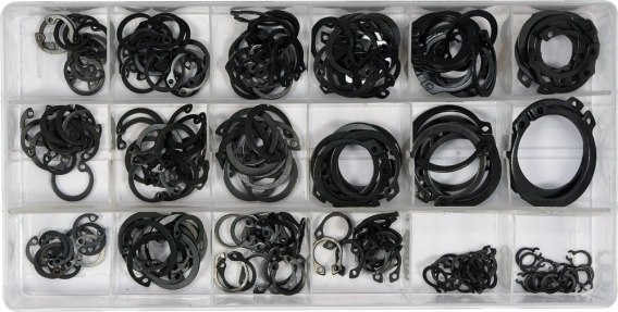 Zawartość zestawu: pierścienie Segera wewnętrzne x70 (O11 mm x15, O13 mm x10, O14 mm x10, O16 mm x15, O19 mm x10, O20 mm x10)|pierścienie Segera zewnętrzne x155 (O6 mm x15, O8 mm x15, O9 mm x15, O11 mm x15, O1
