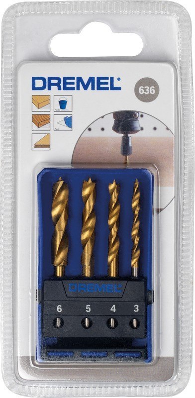 Zestaw 4 wierteł z ostrzem centrującym do wiercenia w drewnie.