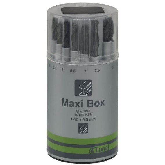 Maxi-Box. Wiertła ze stali szybkotnącej. W plastikowej kasecie z obrotową pokrywką, ustawianą na oznaczeniu odpowiadającym średnicy pożądanego wiertła. W danym ustawieniu można wyjąć tylko jedno wiertło