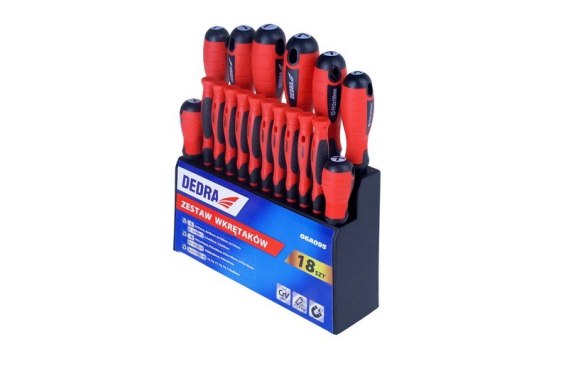 Zestaw 18 sztuk wkrętaków DEDRA 06A095 to doskonały wybór do doposażenia każdego warsztatu czy garażu. Wkrętaki marki DEDRA wykonane są ze stali CrV, chromowanadowej, cechującej się dużą wytrzymałością i odpornością na korozję. Wyprofilowana rękojeść wykonana została z połączenia tworzywa sztucznego oraz gumy. Takie połączenie zapewnia użytkownikowi komfort i wygodę podczas wykonywania prac. Magnetyczna końcówka zapewnia precyzję oraz ułatwia pracę wkrętakiem w trudno dostępnych miejscach. Solidny stojak zapewnia porządek i łatwy dostęp do wkrętaków na miejscu pracy.
