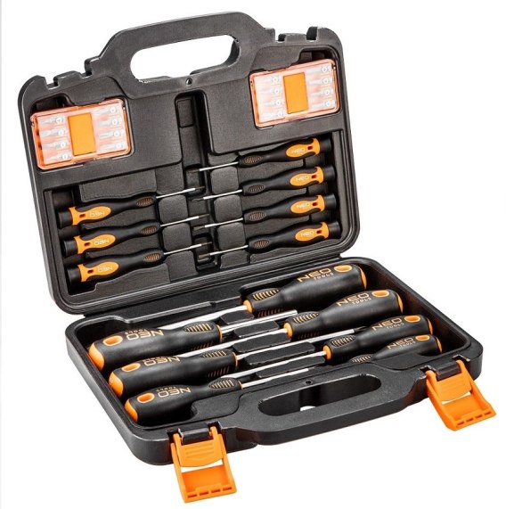 Zestaw wkrętaków i końcówek wkrętakowych NEO (nr ref. 04-209) zawiera 30 wysokiej jakości elementów. Grot każdego wkrętaka wykonany z bardzo wytrzymałej stali S2, zapewniającej długą żywotność. Wkrętaki posiadają magnetyczną końcówkę. Trójgraniasty kształt uchwytu z wyprofilowanym oparciem dla kciuka zmniejsza obciążenie dłoni podczas pracy i ułatwia uzyskanie optymalnego momentu obrotowego. Uchwyt dwumateriałowy zapobiega ślizganiu się w dłoni, odporny jest na działanie chemikaliów, olejów i smarów. Jakość narzędzia potwierdzona 25-letnią gwarancją producenta. To wszystko, razem z 8 najwyżzsej jakości wkrętakami precyzyjnymi oraz 16 bitami o różnych kształtach i rozmiarach, zamknięte w poręcznej walizce, ułatwiającej transport i przechowywanie. Marka NEO spełnia oczekiwania profesjonalistów.