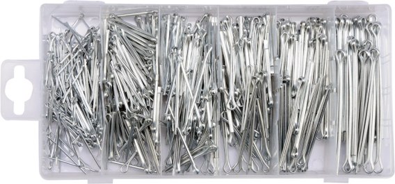 Zawiera 555 zawleczek o różnych rozmiarach.
