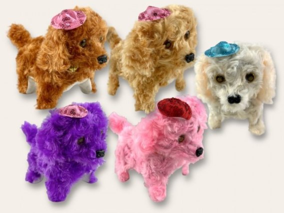 Szczekający interaktywny chodzący piesek z fikuśną sierścią oraz czapeczką w cekiny.