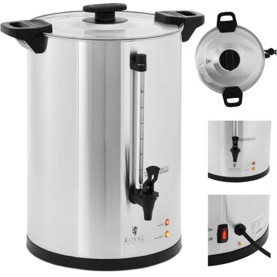 Zaparzacz do kawy marki Royal Catering idealnie nadaje się do produkcji dużych ilości kawy, ale także do parzenia i utrzymywania ciepła herbat lub innych naparów ziołowych. Ekspres o pojemności 20 l i mocy 1650 W szybko podgrzewa gorące napoje i utrzymuje je w odpowiedniej temperaturze. Obudowa zaparzacza została wykonana ze stali nierdzewnej, a nienagrzewające się uchwyty pozwalają na bezpieczne przenoszenie urządzenia nawet po zaparzeniu napoju. Pokrywa ze stali posiada mechanizm blokujący, który zapobiega rozlaniu napoju i zapobiega przed jego zanieczyszczeniem. Zintegrowany wskaźnik poziomu wskazuje liczbę filiżanek i ułatwia porcjowanie kawy. Ekspres pozwoli na napełnienie około 125 filiżanek za pomocą kranu dozującego, który gwarantuje czystość bez kapania. Taca ociekowa przymocowana do podstawy zaparzacza zapewnia wysoki poziom higieny i łatwe czyszczenie.
