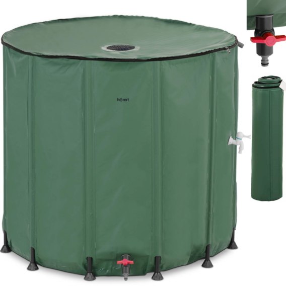 Zbiornik na deszczówkę marki Hillvert posiada dużą pojemność 1000 l. Sprawdzi się w gospodarstwie domowym, w terenie, na biwaku czy na działce. Pojemnik łatwo ustawić, pokrywa z odpornego na rozerwanie PVC naciągana jest za pomocą plastikowych prętów, które zapewniają stabilność. W pokrywie znajduje się otwór do odprowadzania wody deszczowej do wnętrza. Filtr siatkowy zapobiega dostawaniu się do środka zanieczyszczeń oraz liści. Dla optymalnego zarządzania wodą pojemnik posiada trzy odpływy z filtrami utrzymującymi czystość wody. Kran pozwala napełnić konewkę, kurek spustowy na dole ma przyłącze 3/4", można je wykorzystać do węża ogrodowego. Kurek przelewowy chroni beczkę podczas ulewnego deszczu. Wykorzystane materiały są trwałe i przeznaczone do użytku na zewnątrz. Pokrowiec PVC wykonano z tkaniny 500 D. Elastyczne materiały pozwalają złożyć zbiornik do transportu lub przechowywania.