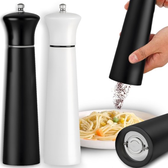 Zestaw dwóch ręcznych młynków do soli, pieprzu i przypraw wykonanych z naturalnego drewna kauczukowego to praktyczne i eleganckie wyposażenie każdej kuchni. Klasyczne kolory biały i czarny pozwalają łatwo odróżnić zawartość młynków, a solidna konstrukcja gwarantuje trwałość i komfort użytkowania. Dzięki uniwersalnemu mechanizmowi młynki sprawdzą się nie tylko do soli i pieprzu, ale również do wielu innych przypraw w ziarnach.