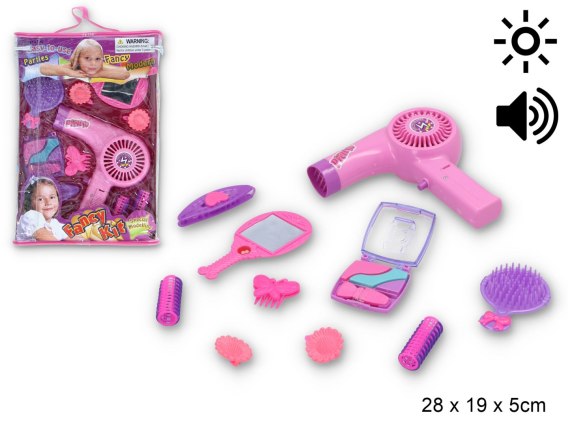 Ta różowa zabawkowa suszarka z efektami dźwiękowymi to strzał w dziesiątkę! W zestawie znajdziesz takie elementy jak: dyfuzor i wąską końcówkę, które pozwolą na tworzenie niezwykłych fryzur.