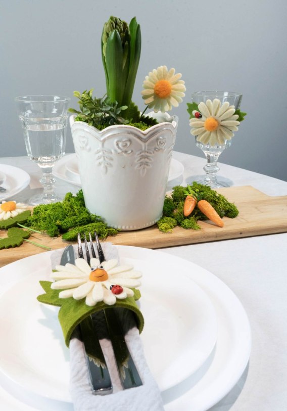- zabawna stokrotka zapinana w pierścień na serwetki, sztućce. Idealne na Wielkanoc,