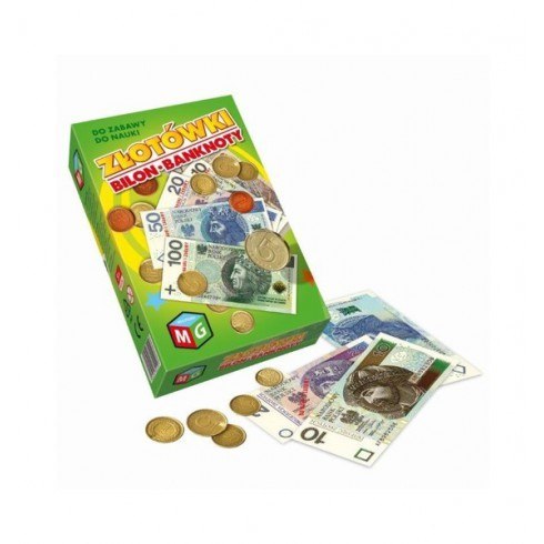 Imitacja polskich pieniędzy w bilonie i w banknotach. Produkt nadaje się doskonale do zabawy i może być wykorzystany jako atrakcyjny rekwizyt różnego rodzaju gier. Jest także cenną pomocą dydaktyczną w poznaniu pierwszych informacji na temat operacji pieniężnych. Zawartość pudełka: 25 banknotów 10 zł, 25 banknotów 20 zł, 25 banknotów 50 zł, 25 banknotów 100 zł, 25 banknotów 200 zł, 4 monety 5 zł, 4 monety 2 zł, 4 monety 1 zł, 4 monet 50 gr, 4 monety 20 gr, 4 monety 10 gr, 4 monety 5 gr, 4 monety 2 gr, 4 monety 1 gr.